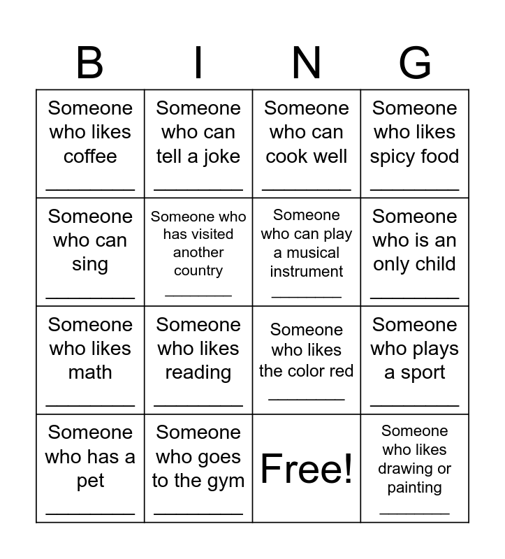 This bingo card has 17 words: Free!, Someone who has a pet ________, Someone who can cook well ________, Someone who likes coffee ________, Someone who likes reading ________, Someone who likes spicy food ________, Someone who plays a sport ________, Someone who can play a musical instrument ________, Someone who is an only child ________, Someone who has visited another country ________, Someone who goes to the gym ________, Someone who likes the color red ________, Someone who can sing ________, Someone who can tell a joke ________, Someone who likes math ________, Someone who likes dancing ________ and Someone who likes drawing or painting ________.