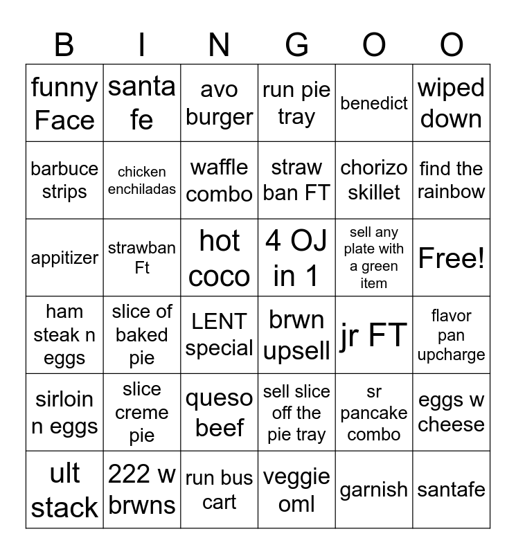 This bingo card has 37 words: sr pancake combo, sell slice off the pie tray, garnish, barbuce strips, slice of baked pie, sell any plate with a green item, chicken enchiladas, veggie oml, benedict, ult stack, find the rainbow, run pie tray, appitizer, hot coco, wiped down, 4 OJ in 1, slice creme pie, avo burger, Free!, strawban Ft, funny Face, straw ban FT, LENT special, jr FT, 222 w brwns, flavor pan upcharge, santa fe, run bus cart, eggs w cheese, queso beef, run buscart, brwn upsell, chorizo skillet, sirloin n eggs, ham steak n eggs, waffle combo and santafe.