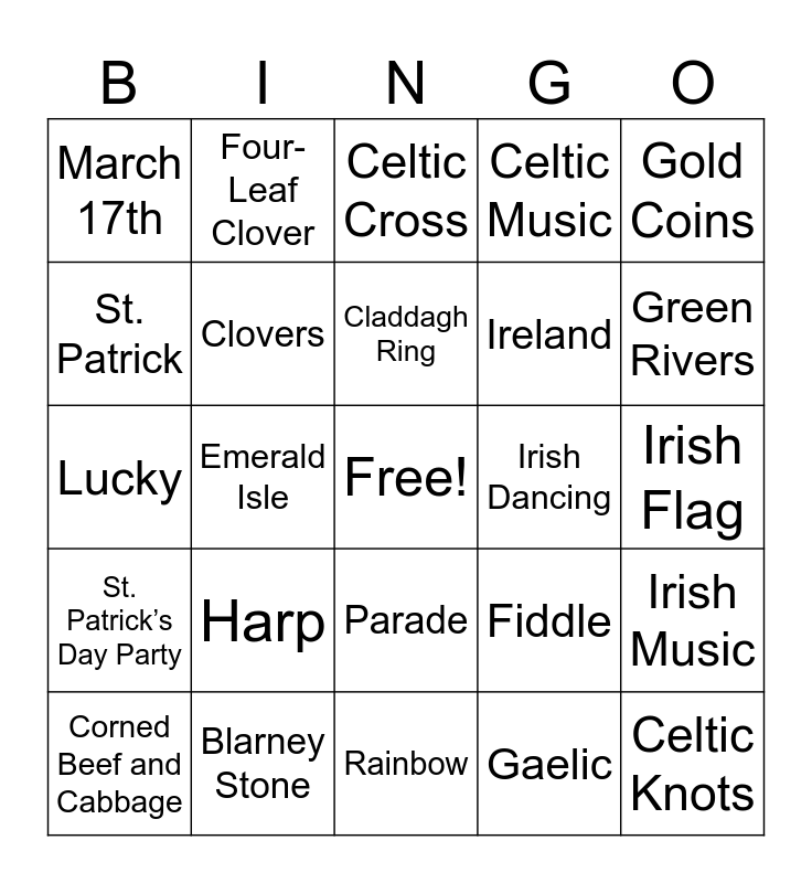 This bingo card has a free space and 34 words: Leprechaun, Shamrock, Green, Pot of Gold, Irish Flag, St. Patrick, Clovers, Rainbow, Ireland, Celtic Knots, Lucky, Four-Leaf Clover, Gaelic, Bagpipes, St. Patrick’s Day Party, Emerald Isle, Parade, Irish Dancing, Irish Music, Corned Beef and Cabbage, Blarney Stone, Dublin, Celtic Music, Green Rivers, Irish Blessing, Harp, Celtic Cross, "Kiss Me, I’m Irish", Gold Coins, March 17th, Soda Bread, Claddagh Ring, Fiddle and Irish Setter.