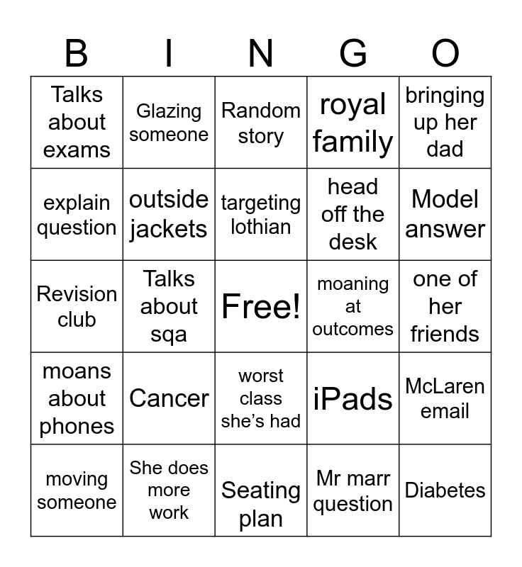 This bingo card has a free space and 24 words: Cancer, She does more work, targeting lothian, moving someone, bringing up her dad, Talks about exams, explain question, Glazing someone, moaning at outcomes, worst class she’s had, head off the desk, Revision club, iPads, McLaren email, outside jackets, Mr marr question, one of her friends, Random story, Model answer, Talks about sqa, Diabetes, moans about phones, royal family and Seating plan.