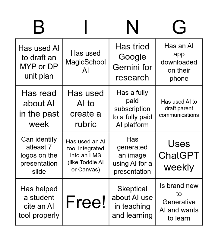 This bingo card has 16 words: Free!, Uses ChatGPT weekly, Has tried Google Gemini for research, Has used AI to draft an MYP or DP unit plan, Can identify atleast 7 logos on the presentation slide, Has used MagicSchool AI, Has generated an image using AI for a presentation, Skeptical about AI use in teaching and learning, Has read about AI in the past week, Has used AI to create a rubric, Has helped a student cite an AI tool properly, Has an AI app downloaded on their phone, Has used an AI tool integrated into an LMS (like Toddle AI or Canvas), Has used AI to draft parent communications, Has a fully paid subscription to a fully paid AI platform and Is brand new to Generative AI and wants to learn.