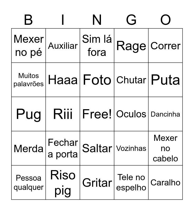 This bingo card has a free space and 24 words: Fechar a porta, Riso pig, Foto, Pessoa qualquer, Correr, Mexer no pé, Muitos palavrões, Auxiliar, Oculos, Saltar, Chutar, Pug, Vozinhas, Mexer no cabelo, Haaa, Tele no espelho, Dancinha, Sim lá fora, Puta, Riii, Caralho, Merda, Rage and Gritar.