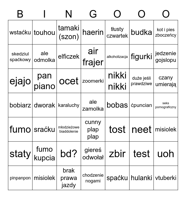 This bingo card has a free space and 48 words: zbir, figurki, chodzenie nogami, dworak, ocet, seks pornograficzny, touhou, misiolek, budka, cunny plap plap, kot i pies zboczeńcy, haerin, duże jeśli prawdziwe, nikki nikki, staty, ćpuncian, skedziul spaćkowy, jedzenie gojslopu, test, tłusty czwartek, alkoholizacja, karaluchy, wstaćku, ale odmolka, uoh, elficzek, czany umierają, pinpanpon, zoomerki, pan piano, hulanki, bobas, misiolek, fumo kupcia, bobiarz, tost, neet, ejajo, młodzieżowe biaddolenie, bd?, fumo, vtuberki, tamaki (szon), brak prawa jazdy, air frajer, giereś odwołał, sraćku and spaćku.