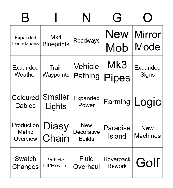This bingo card has 25 words: Diasy Chain, Fluid Overhaul, Vehicle Pathing, Swatch Changes, Mirror Mode, Expanded Foundations, Expanded Weather, Mk4 Blueprints, Farming, New Decorative Builds, Mk3 Pipes, Coloured Cables, Paradise Island, New Machines, Train Waypoints, Golf, Logic, Roadways, Expanded Signs, Smaller Lights, Expanded Power, Vehicle Lift/Elevator, Production Metric Overview, New Mob and Hoverpack Rework.