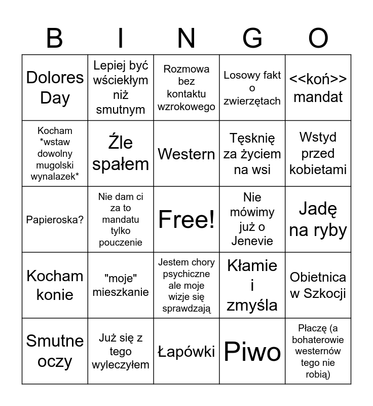 This bingo card has a free space and 24 words: "moje" mieszkanie, Już się z tego wyleczyłem, Western, Smutne oczy, <<koń>> mandat, Dolores Day, Kocham *wstaw dowolny mugolski wynalazek*, Lepiej być wściekłym niż smutnym, Nie mówimy już o Jenevie, Jestem chory psychiczne ale moje wizje się sprawdzają, Tęsknię za życiem na wsi, Papieroska?, Kłamie i zmyśla, Obietnica w Szkocji, Źle spałem, Piwo, Jadę na ryby, Rozmowa bez kontaktu wzrokowego, Wstyd przed kobietami, Nie dam ci za to mandatu tylko pouczenie, Płaczę (a bohaterowie westernów tego nie robią), Kocham konie, Losowy fakt o zwierzętach and Łapówki.