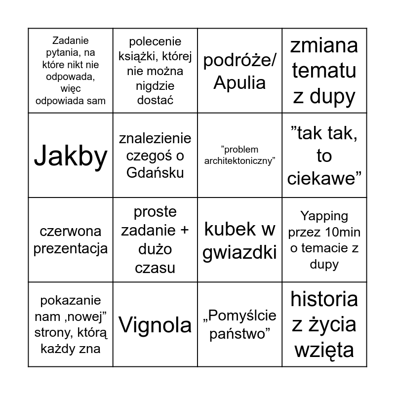 This bingo card has 16 words: Vignola, Yapping przez 10min o temacie z dupy, podróże/ Apulia, Zadanie pytania, na które nikt nie odpowada, więc odpowiada sam, czerwona prezentacja, polecenie książki, której nie można nigdzie dostać, kubek w gwiazdki, „Pomyślcie państwo”, Jakby, znalezienie czegoś o Gdańsku, pokazanie nam ‚nowej” strony, którą każdy zna, zmiana tematu z dupy, proste zadanie + dużo czasu, ”tak tak, to ciekawe”, ”problem architektoniczny” and historia z życia wzięta.