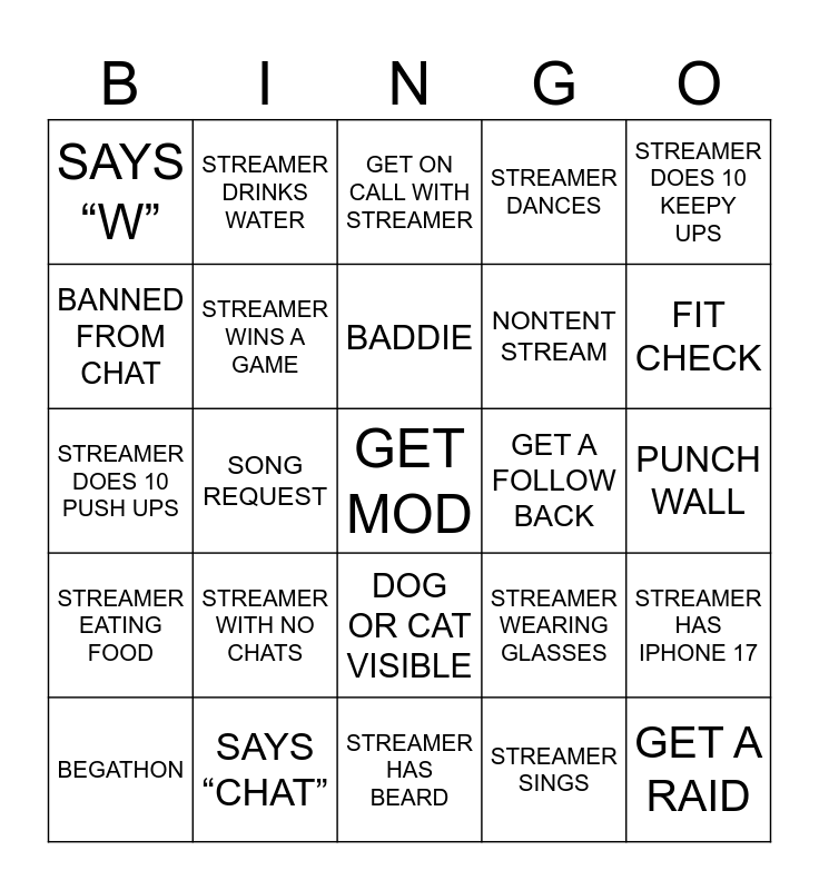 This bingo card has a free space and 24 words: STREAMER WITH NO CHATS, SAYS “CHAT”, BADDIE, BEGATHON, STREAMER DOES 10 KEEPY UPS, SAYS “W”, BANNED FROM CHAT, STREAMER DRINKS WATER, GET A FOLLOW BACK, DOG OR CAT VISIBLE, NONTENT STREAM, STREAMER DOES 10 PUSH UPS, STREAMER WEARING GLASSES, STREAMER HAS IPHONE 17, STREAMER WINS A GAME, STREAMER SINGS, PUNCH WALL, GET ON CALL WITH STREAMER, FIT CHECK, SONG REQUEST, GET A RAID, STREAMER EATING FOOD, STREAMER DANCES and STREAMER HAS BEARD.