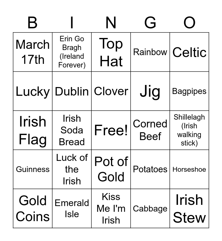 This bingo card has a free space and 35 words: Shamrock, Leprechaun, Ireland, Dublin, Pot of Gold, Rainbow, Lucky, Green, Clover, Four-Leaf Clover, Irish Flag, Celtic, Harp, St. Patrick, March 17th, Corned Beef, Cabbage, Irish Soda Bread, Guinness, Irish Stew, Potatoes, Gold Coins, Horseshoe, Emerald Isle, Top Hat, Bagpipes, Celtic Cross, Irish Dance, Jig, Shillelagh (Irish walking stick), Blarney Stone, Kiss Me I'm Irish, Luck of the Irish, Erin Go Bragh (Ireland Forever) and Sláinte (Cheers/Health).