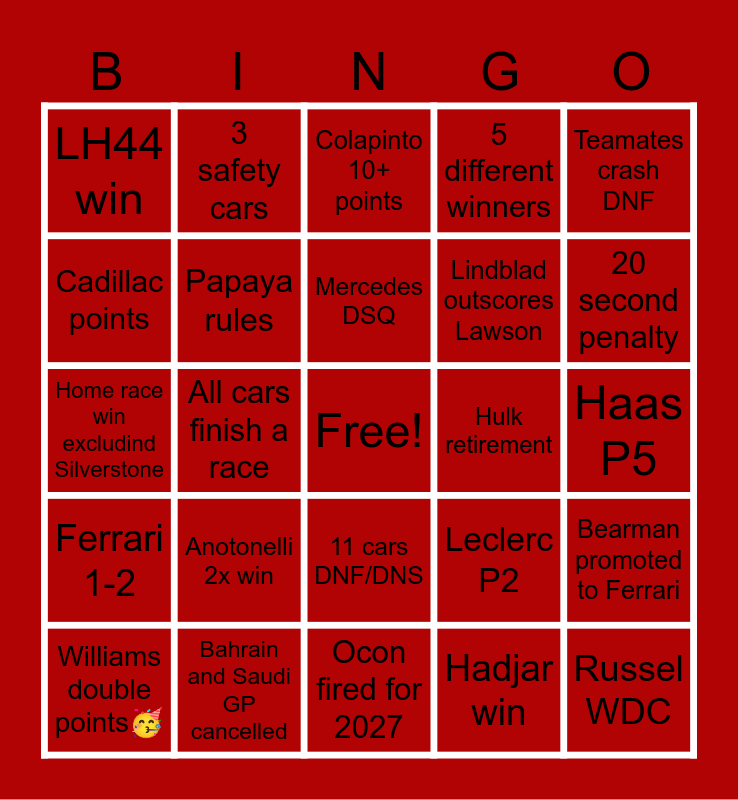 This bingo card has a free space and 24 words: Anotonelli 2x win, Bahrain and Saudi GP cancelled, Mercedes DSQ, Williams double points🥳, Teamates crash DNF, LH44 win, Cadillac points, 3 safety cars, Hulk retirement, 11 cars DNF/DNS, Lindblad outscores Lawson, Home race win excludind Silverstone, Leclerc P2, Bearman promoted to Ferrari, Papaya rules, Hadjar win, Haas P5, Colapinto 10+ points, 20 second penalty, All cars finish a race, Russel WDC, Ferrari 1-2, 5 different winners and Ocon fired for 2027.