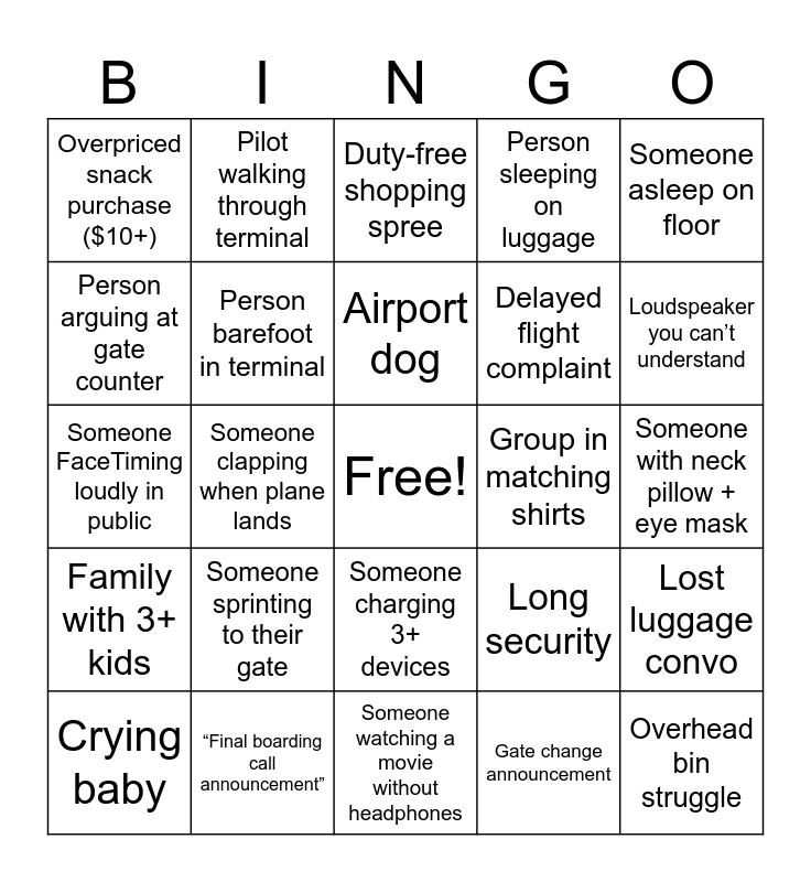 This bingo card has a free space and 24 words: Someone sprinting to their gate, “Final boarding call announcement”, Airport dog, Crying baby, Someone asleep on floor, Overpriced snack purchase ($10+), Person arguing at gate counter, Pilot walking through terminal, Group in matching shirts, Someone charging 3+ devices, Delayed flight complaint, Someone FaceTiming loudly in public, Long security, Lost luggage convo, Person barefoot in terminal, Gate change announcement, Someone with neck pillow + eye mask, Duty-free shopping spree, Loudspeaker you can’t understand, Someone clapping when plane lands, Overhead bin struggle, Family with 3+ kids, Person sleeping on luggage and Someone watching a movie without headphones.