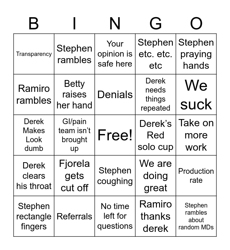 This bingo card has a free space and 24 words: Fjorela gets cut off, Referrals, Denials, Stephen rectangle fingers, Stephen praying hands, Transparency, Ramiro rambles, Stephen rambles, Derek’s Red solo cup, Stephen coughing, Derek needs things repeated, Derek Makes Look dumb, We are doing great, Production rate, Betty raises her hand, Ramiro thanks derek, Take on more work, Your opinion is safe here, We suck, GI/pain team isn’t brought up, Stephen rambles about random MDs, Derek clears his throat, Stephen etc. etc. etc and No time left for questions.