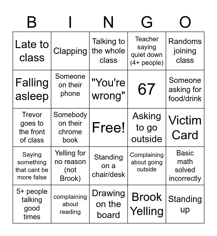 This bingo card has a free space and 24 words: Yelling for no reason (not Brook), complaining about reading, "You're wrong", 5+ people talking good times, Randoms joining class, Late to class, Falling asleep, Clapping, Asking to go outside, Standing on a chair/desk, 67, Trevor goes to the front of class, Complaining about going outside, Basic math solved incorrectly, Someone on their phone, Brook Yelling, Victim Card, Talking to the whole class, Someone asking for food/drink, Somebody on their chrome book, Standing up, Saying something that cant be more false, Teacher saying quiet down (4+ people) and Drawing on the board.