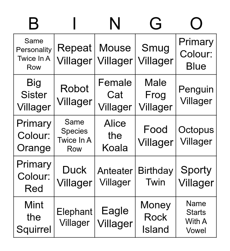 This bingo card has 25 words: Duck Villager, Eagle Villager, Female Cat Villager, Mint the Squirrel, Primary Colour: Blue, Same Personality Twice In A Row, Big Sister Villager, Repeat Villager, Food Villager, Anteater Villager, Male Frog Villager, Primary Colour: Orange, Birthday Twin, Sporty Villager, Robot Villager, Name Starts With A Vowel, Octopus Villager, Mouse Villager, Penguin Villager, Same Species Twice In A Row, Alice the Koala, Elephant Villager, Primary Colour: Red, Smug Villager and Money Rock Island.