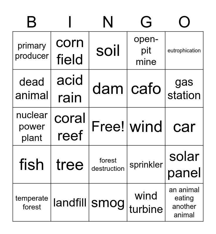 This bingo card has a free space and 24 words: tree, landfill, dam, temperate forest, eutrophication, primary producer, dead animal, corn field, wind, forest destruction, cafo, nuclear power plant, sprinkler, solar panel, acid rain, wind turbine, car, soil, gas station, coral reef, an animal eating another animal, fish, open-pit mine and smog.