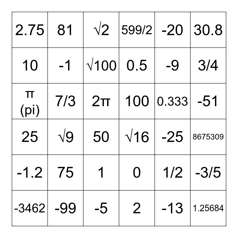 This bingo card has 36 words: 0, 1, 2, 10, 25, 100, -1, -5, -20, 1/2, 3/4, 599/2, -3/5, 7/3, 0.5, 2.75, -1.2, 0.333, π (pi), √2, 2π, √9, √16, 50, -25, 81, -9, -99, √100, 30.8, 1.25684, -3462, 8675309, -51, 75 and -13.