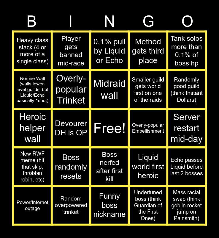 This bingo card has a free space and 24 words: Boss randomly resets, Random overpowered trinket, Midraid wall, Power/Internet outage, Tank solos more than 0.1% of boss hp, Heavy class stack (4 or more of a single class), Normie Wall (walls lower-level guilds, but Liquid/Echo basically 1shot), Player gets banned mid-race, Overly-popular Embellishment, Boss nerfed after first kill, Smaller guild gets world first on one of the raids, Heroic helper wall, Liquid world first heroic, Echo passes Liquid before last 2 bosses, Overly-popular Trinket, Undertuned boss (think Guardian of the First Ones), Server restart mid-day, 0.1% pull by Liquid or Echo, Randomly good guild (think Instant Dollars), Devourer DH is OP, Mass racial swap (think goblin rocket jump on Painsmith), New RWF meme (hit that skip, throbbin robin, etc), Method gets third place and Funny boss nickname.