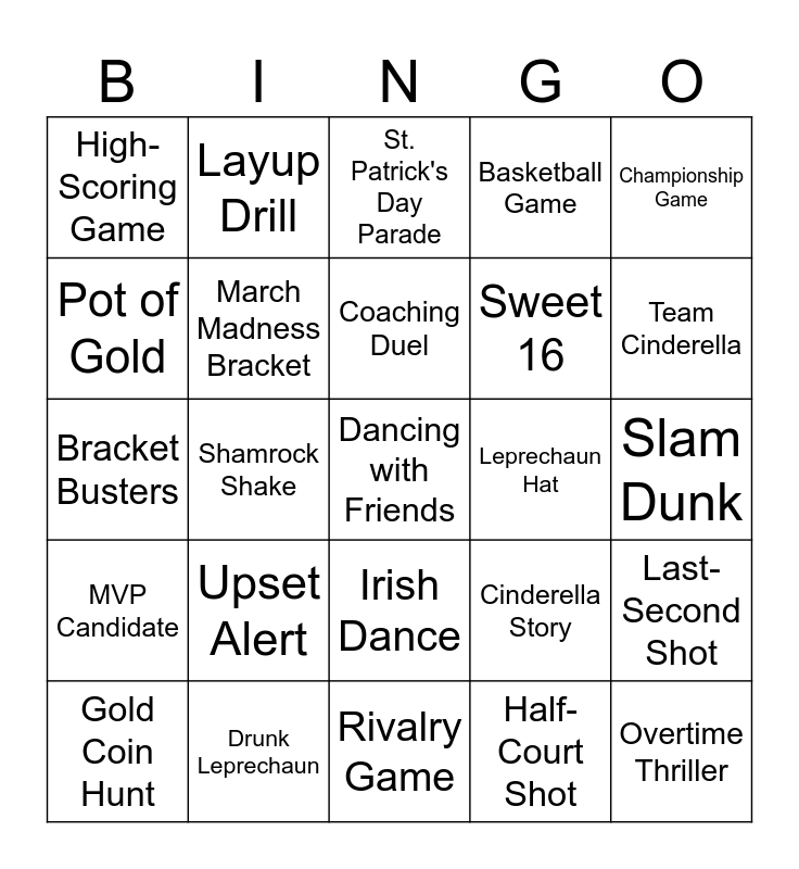 This bingo card has 55 words: Free!, Shamrock Shake, Final Four, Basketball Game, Green Beer, Celtic Music, March Madness Bracket, Corned Beef and Cabbage, Leprechaun Hat, Three-Point Shot, Pot of Gold, Basketball Court, Irish Dance, Free Throw, NCAA Tournament, Lucky Charms Cereal, Layup Drill, St. Patrick's Day Parade, Buzzer Beater, Slam Dunk, Gold Coin Hunt, Drunk Leprechaun, Dancing with Friends, Sweet 16, Irish Coffee, Bracket Busters, Upset Alert, Final Four Predictions, Cinderella Story, Overtime Thriller, Three-Point Barrage, First-Round Upset, Sweet Sixteen, Elite Eight, Championship Game, MVP Candidate, Player to Watch, Coaching Duel, Defensive Standoff, Nail-Biter Finish, High-Scoring Game, Tournament History, Fan Reaction Shot, Announcer's Call, Last-Second Shot, Hyped Matchup, Scoring Run, Rivalry Game, Injury Update, Team Cinderella, Athletic Dunk, Clutch Free Throws, Game Changer, Half-Court Shot and Victory Celebration.