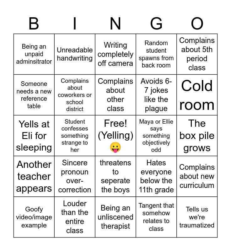 This bingo card has a free space and 55 words: (Justifiably) yells at Ben, Bullies Eli, Infinite Kays (camera flip), Random student spawns from back room, Complains about new curriculum, Unrelated tangent to class, Complains about coworkers or school district, Spends 20 minutes of class chatting with students, Avoids 6-7 jokes like the plague, Tired of class, Being an unpaid adminsitrator, Panicking about being out for half the week, Husband mention, Finds any opportunity to blame Ben, Uses Tilly as example, Confused by student, Writing completely off camera, Maya or Ellie says something objectively odd, Hate rants, Another teacher appears, Louder than the entire class, Being an unliscened therapist, Tangent that somehow relates to class, Complains about 5th period class, Camera stops working, Student confesses something strange to her, Complains about other class, Out of left field pop culture reference, Cold room, Refuses to do new curriculum, Complains about being off-track then stays off-track for 15+ minutes, threatens to seperate the boys, Gives class existential crisis, Nerf Gun, Someone needs a new reference table, Sincere pronoun over-correction, Road rage mention, Hates everyone below the 11th grade, Tells us we're traumatized, Not a big fan of the government, Unreadable handwriting, Reads question wrong/gives us wrong answer, Tells us to cross off a question on packet, "Write your givens!!", Goofy video/image example, Overhears something crazy, Extends the work extention, "Some old white dude", We never get to the actual assigment, Yells at Eli for sleeping, Spawns from nowhere, Forgets to do attendance, Community service opportunities, The box pile grows and Sends student back to their actual class.