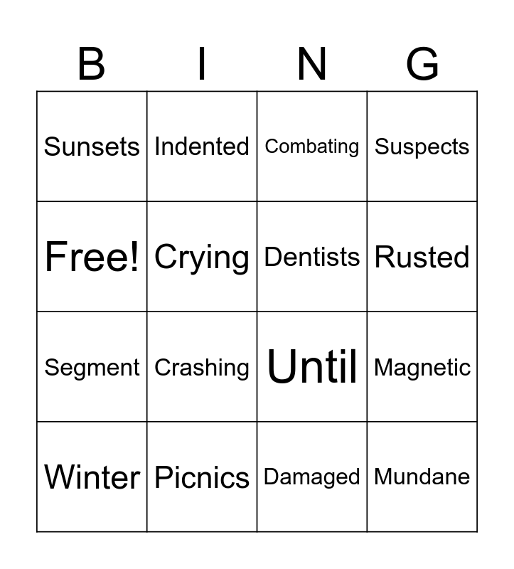 This bingo card has 16 words: Picnics, Magnetic, Combating, Sunsets, Segment, Indented, Until, Damaged, Free!, Crying, Winter, Suspects, Crashing, Rusted, Dentists and Mundane.