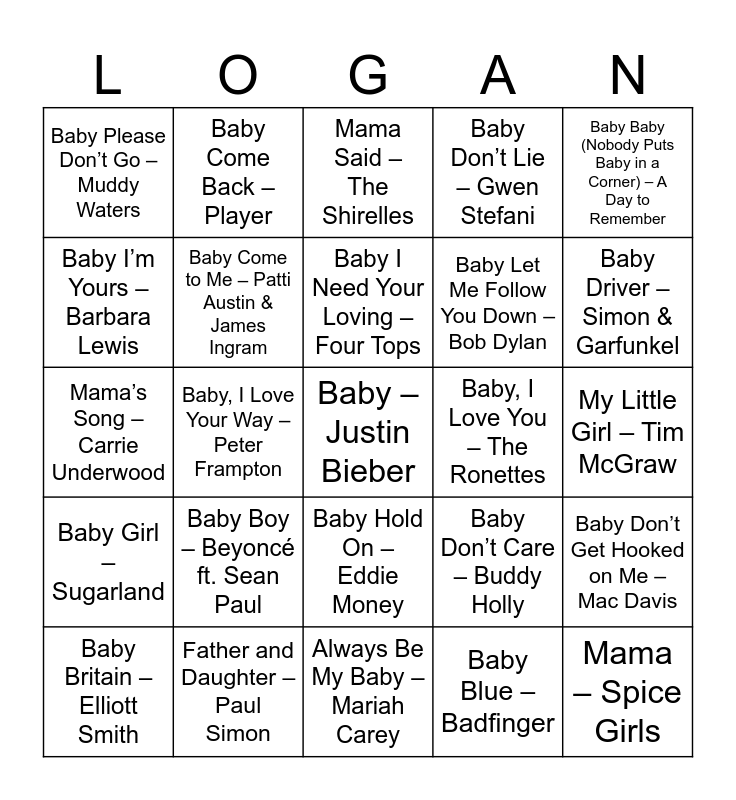 This bingo card has 46 words: Baby One More Time – Britney Spears, Baby – Justin Bieber, Baby Love – The Supremes, Always Be My Baby – Mariah Carey, Baby Boy – Beyoncé ft. Sean Paul, Baby I – Ariana Grande, Baby Come Back – Player, Baby, Baby – Amy Grant, Baby I’m Yours – Barbara Lewis, Baby Be Mine – Michael Jackson, Baby Come to Me – Patti Austin & James Ingram, Baby Don’t Lie – Gwen Stefani, Baby Don’t Get Hooked on Me – Mac Davis, Baby Don’t Care – Buddy Holly, Baby Don’t Hurt Me – Haddaway, Baby Baby – Corona, Baby I Need Your Loving – Four Tops, Baby, I Love You – The Ronettes, Baby Talks Dirty – The Knack, Baby Baby (Nobody Puts Baby in a Corner) – A Day to Remember, Baby, I Love Your Way – Peter Frampton, Baby Blue – Badfinger, Baby Please Don’t Go – Muddy Waters, Baby Let Me Follow You Down – Bob Dylan, Baby’s in Black – The Beatles, Baby Driver – Simon & Garfunkel, Baby Britain – Elliott Smith, Baby Come Back – The Equals, Baby Hold On – Eddie Money, Baby Girl – Sugarland, Baby Be My Love Song – Easton Corbin, Baby’s Got Her Blue Jeans On – Mel McDaniel, Baby Don’t You Know – Reba McEntire, Daughters – John Mayer, In My Daughter’s Eyes – Martina McBride, Father and Daughter – Paul Simon, My Little Girl – Tim McGraw, Isn’t She Lovely – Stevie Wonder, Sweet Child O’ Mine – Guns N’ Roses, Butterfly Kisses – Bob Carlisle, Mama – Spice Girls, Mama Said – The Shirelles, Mama’s Song – Carrie Underwood, Hey Mama – Mat Kearney, Mother Like Mine – The Band Perry and Mama Mia – ABBA.