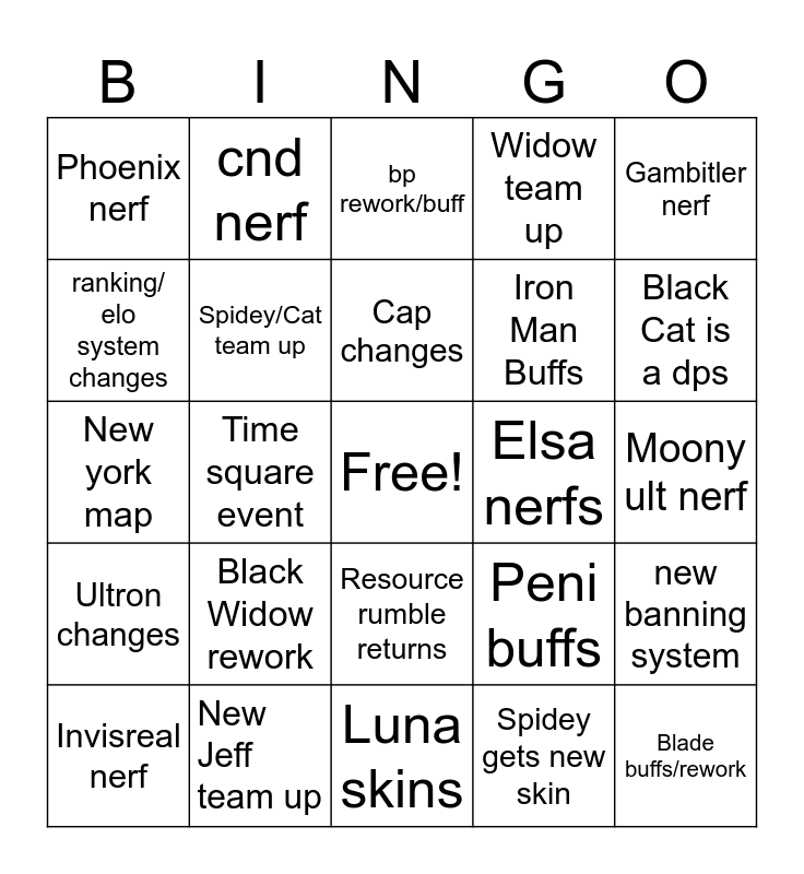 This bingo card has a free space and 24 words: Invisreal nerf, Black Widow rework, Cap changes, Spidey gets new skin, Gambitler nerf, Phoenix nerf, cnd nerf, bp rework/buff, Elsa nerfs, Moony ult nerf, New york map, Spidey/Cat team up, Peni buffs, new banning system, ranking/ elo system changes, New Jeff team up, Luna skins, Widow team up, Black Cat is a dps, Ultron changes, Time square event, Resource rumble returns, Iron Man Buffs and Blade buffs/rework.