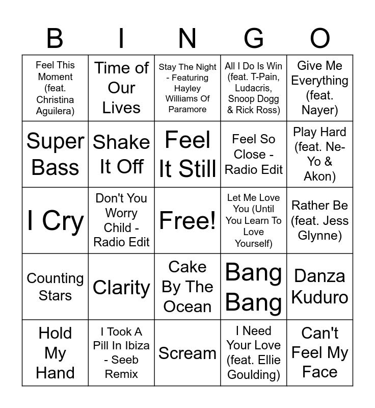 This bingo card has a free space and 65 words: Timber, Wake Me Up, We Found Love, Danza Kuduro, Party Rock Anthem, Cooler Than Me - Single Mix, Time of Our Lives, I Love It (feat. Charli XCX), Feel It Still, Domino, Cake By The Ocean, Starships, Rather Be (feat. Jess Glynne), Give Me Everything (feat. Nayer), Only Girl (In The World), Super Bass, Don't You Worry Child - Radio Edit, Feel This Moment (feat. Christina Aguilera), Hey Brother, Feel So Close - Radio Edit, Clarity, Counting Stars, All I Do Is Win (feat. T-Pain, Ludacris, Snoop Dogg & Rick Ross), Can't Hold Us (feat. Ray Dalton), Like A G6, Part Of Me, Uptown Funk (feat. Bruno Mars), Sexy And I Know It, Can't Feel My Face, Cheerleader - Felix Jaehn Remix Radio Edit, Hold My Hand, Get Lucky (Radio Edit) [feat. Pharrell Williams and Nile Rodgers], High Hopes, 24K Magic, Bang Bang, I Took A Pill In Ibiza - Seeb Remix, Where Them Girls At (feat. Nicki Minaj & Flo Rida), I Cry, I Need Your Love (feat. Ellie Goulding), CAN'T STOP THE FEELING! (from DreamWorks Animation's "TROLLS"), Shake It Off, Meant to Be (feat. Florida Georgia Line), Let Me Love You (Until You Learn To Love Yourself), Black Widow, La La La, This Is What You Came For, Play Hard (feat. Ne-Yo & Akon), Where Have You Been, Sorry For Party Rocking, Sweet but Psycho, Talk Dirty (feat. 2 Chainz), Outside (feat. Ellie Goulding), Lean On, Scream, Prayer in C - Robin Schulz Radio Edit, Hideaway, Waves - Robin Schulz Radio Edit, Stay The Night - Featuring Hayley Williams Of Paramore, Turn Down for What, Cheap Thrills (feat. Sean Paul), The Hills, Summertime Sadness (Lana Del Rey Vs. Cedric Gervais) - Cedric Gervais Remix, Run the World (Girls), More - RedOne Jimmy Joker Remix and Are You With Me.