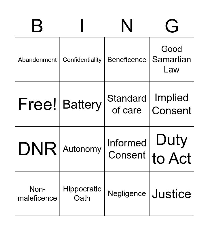 This bingo card has 16 words: Hippocratic Oath, Duty to Act, Beneficence, Abandonment, DNR, Confidentiality, Informed Consent, Negligence, Free!, Battery, Non-maleficence, Good Samartian Law, Autonomy, Implied Consent, Standard of care and Justice.