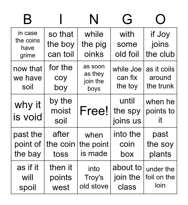 This bingo card has a free space and 24 words: after the coin toss, then it points west, as soon as they join the boys, as if it will spoil, if Joy joins the club, in case the coins have grime, now that we have soil, so that the boy can toil, until the spy joins us, when the point is made, while Joe can fix the toy, why it is void, into the coin box, past the soy plants, for the coy boy, about to join the class, when he points to it, while the pig oinks, as it coils around the trunk, by the moist soil, under the foil on the loin, past the point of the bay, with some old foil and into Troy's old stove.