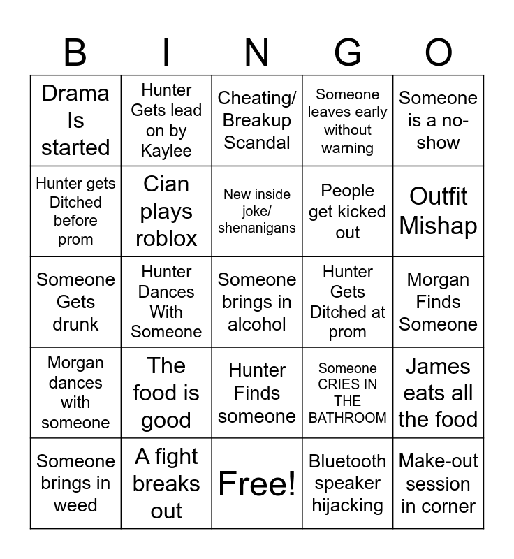 This bingo card has 25 words: Morgan dances with someone, A fight breaks out, Someone brings in alcohol, Bluetooth speaker hijacking, Someone is a no-show, Drama Is started, Hunter Gets lead on by Kaylee, Cheating/ Breakup Scandal, Hunter Gets Ditched at prom, James eats all the food, Hunter gets Ditched before prom, Cian plays roblox, Free!, Someone CRIES IN THE BATHROOM, Outfit Mishap, Someone brings in weed, Hunter Dances With Someone, New inside joke/ shenanigans, People get kicked out, Morgan Finds Someone, Someone Gets drunk, The food is good, Hunter Finds someone, Someone leaves early without warning and Make-out session in corner.