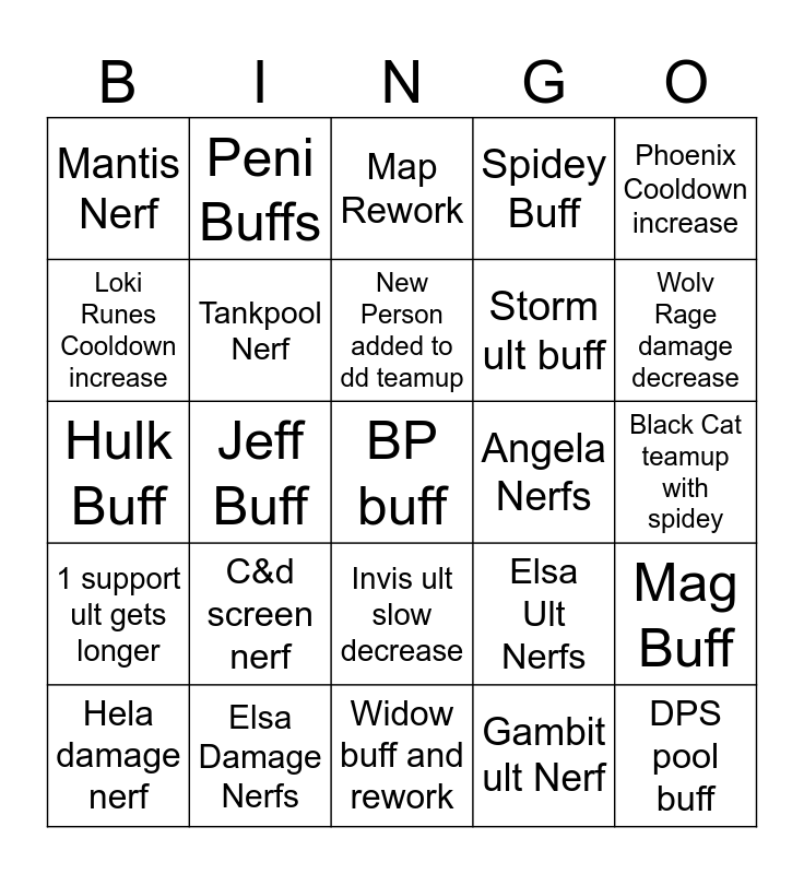 This bingo card has 25 words: C&d screen nerf, Widow buff and rework, New Person added to dd teamup, Hela damage nerf, Phoenix Cooldown increase, Mantis Nerf, Loki Runes Cooldown increase, Peni Buffs, Angela Nerfs, Invis ult slow decrease, Storm ult buff, Hulk Buff, Elsa Ult Nerfs, Mag Buff, Tankpool Nerf, DPS pool buff, Black Cat teamup with spidey, Map Rework, Wolv Rage damage decrease, Jeff Buff, BP buff, Elsa Damage Nerfs, 1 support ult gets longer, Spidey Buff and Gambit ult Nerf.