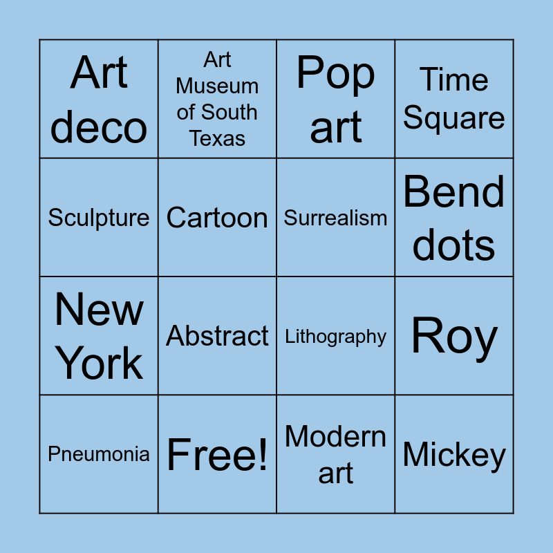 This bingo card has 16 words: Free!, Roy, Pop art, Art deco, New York, Art Museum of South Texas, Lithography, Modern art, Sculpture, Cartoon, Pneumonia, Time Square, Abstract, Bend dots, Surrealism and Mickey.