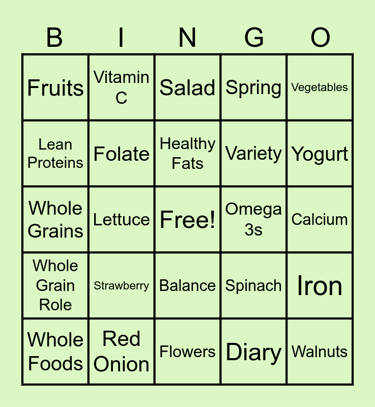 This bingo card has a free space and 24 words: Strawberry, Red Onion, Healthy Fats, Whole Foods, Vegetables, Fruits, Lean Proteins, Vitamin C, Omega 3s, Balance, Variety, Whole Grains, Spinach, Iron, Folate, Diary, Calcium, Salad, Yogurt, Lettuce, Walnuts, Whole Grain Role, Spring and Flowers.