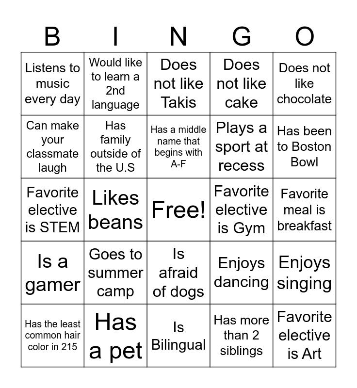 This bingo card has a free space and 29 words: Has the least common hair color in 215, Big fan of fruits, Likes beans, Would like to learn a 2nd language, Listens to music every day, Does not like Takis, Has family outside of the U.S, Goes to summer camp, Favorite elective is Gym, Has a pet, Favorite meal is breakfast, Favorite elective is Art, Is Bilingual, Has more than 2 siblings, Has been to Boston Bowl, Would like to write songs, Is afraid of dogs, Is a gamer, Does not like chocolate, Favorite elective is STEM, Enjoys dancing, Will one day become famous, Plays a sport at recess, Can make your classmate laugh, Does not like cake, Would like to learn a 2nd language, Enjoys singing, Has a middle name that begins with A-F and Is a righty.