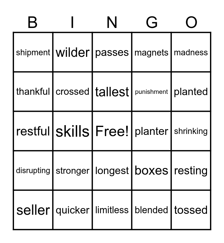 This bingo card has a free space and 24 words: stronger, quicker, tallest, seller, madness, shipment, thankful, wilder, planter, longest, punishment, restful, boxes, resting, crossed, blended, shrinking, passes, planted, skills, tossed, disrupting, magnets and limitless.