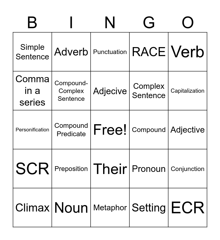 This bingo card has a free space and 24 words: Preposition, Noun, Adjecive, Climax, Verb, Simple Sentence, Comma in a series, Adverb, Compound, Their, Complex Sentence, Personification, Pronoun, Conjunction, Compound-Complex Sentence, Setting, Adjective, Punctuation, Capitalization, Compound Predicate, ECR, SCR, RACE and Metaphor.
