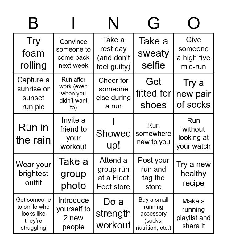 This bingo card has a free space and 41 words: Complete a speed workout, Run in the rain, Run before the sun comes up, Run after work (even when you didn’t want to), Introduce yourself to 2 new people, Attend a group run at a Fleet Feet store, Cheer for someone else during a run, Post in the Facebook page, Give someone a high five mid-run, Wear your brightest outfit, Invite a friend to your workout, Take a sweaty selfie, Make a running playlist and share it, Run without looking at your watch, Run somewhere new to you, Take a group photo, Spot someone wearing the same shoes as you, Try foam rolling, Prioritize 8 hours of sleep, Take a rest day (and don’t feel guilty), Try a new healthy recipe, Hydrate before your run, Do a strength workout, Get fitted for shoes, Try on a new brand, Test a demo shoe at a group run, Buy a small running accessory (socks, nutrition, etc.), Learn about injury prevention, Try a new pair of socks, Tell a terrible running joke mid-run, Be the hype person for the last finisher, Convince someone to come back next week, Get someone to smile who looks like they’re struggling, Take a group selfie with 5+ people, Post your run and tag the store, Capture a sunrise or sunset run pic, Take a “before & after” sweaty photo, Record a short “why I run” video and post to our FB group, Get in the background of someone else’s photo, Bring snacks to share and Spot a dog and say hi.