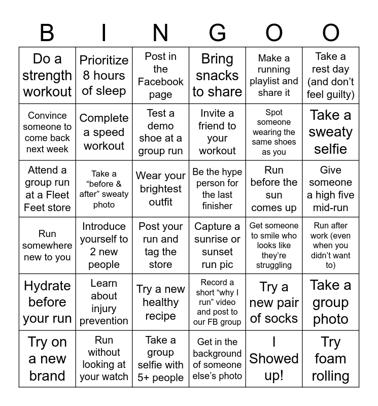 This bingo card has 42 words: I Showed up!, Complete a speed workout, Run in the rain, Run before the sun comes up, Run after work (even when you didn’t want to), Introduce yourself to 2 new people, Attend a group run at a Fleet Feet store, Cheer for someone else during a run, Post in the Facebook page, Give someone a high five mid-run, Wear your brightest outfit, Invite a friend to your workout, Take a sweaty selfie, Make a running playlist and share it, Run without looking at your watch, Run somewhere new to you, Take a group photo, Spot someone wearing the same shoes as you, Try foam rolling, Prioritize 8 hours of sleep, Take a rest day (and don’t feel guilty), Try a new healthy recipe, Hydrate before your run, Do a strength workout, Get fitted for shoes, Try on a new brand, Test a demo shoe at a group run, Buy a small running accessory (socks, nutrition, etc.), Learn about injury prevention, Try a new pair of socks, Tell a terrible running joke mid-run, Be the hype person for the last finisher, Convince someone to come back next week, Get someone to smile who looks like they’re struggling, Take a group selfie with 5+ people, Post your run and tag the store, Capture a sunrise or sunset run pic, Take a “before & after” sweaty photo, Record a short “why I run” video and post to our FB group, Get in the background of someone else’s photo, Bring snacks to share and Spot a dog and say hi.