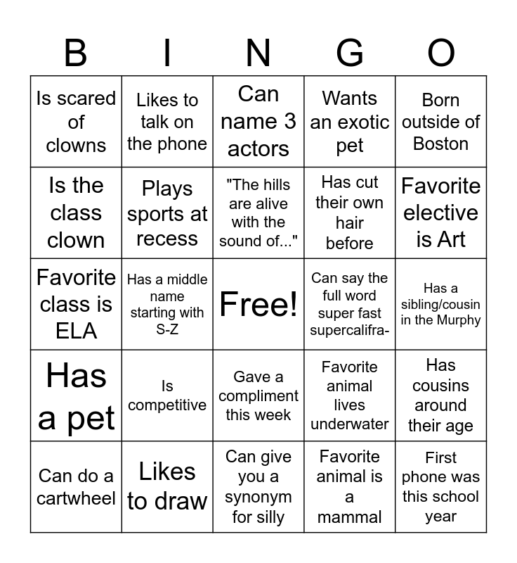 This bingo card has a free space and 24 words: Is competitive, Likes to draw, "The hills are alive with the sound of...", Can do a cartwheel, Born outside of Boston, Is scared of clowns, Is the class clown, Likes to talk on the phone, Can say the full word super fast supercalifra-, Gave a compliment this week, Has cut their own hair before, Favorite class is ELA, Favorite animal lives underwater, Has cousins around their age, Plays sports at recess, Favorite animal is a mammal, Has a sibling/cousin in the Murphy, Can name 3 actors, Favorite elective is Art, Has a middle name starting with S-Z, First phone was this school year, Has a pet, Wants an exotic pet and Can give you a synonym for silly.