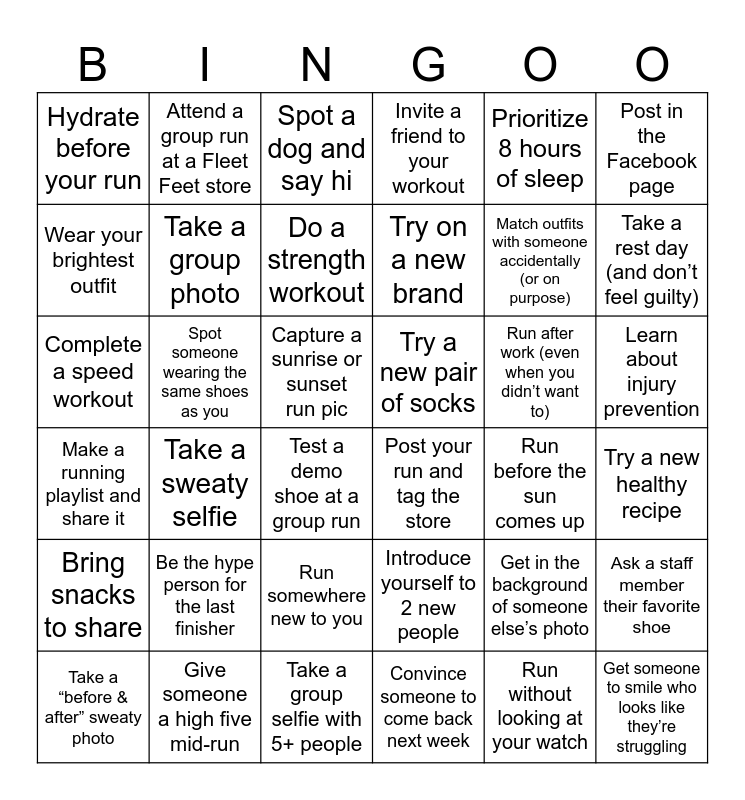 This bingo card has 46 words: I Showed up!, Complete a speed workout, Run in the rain, Run before the sun comes up, Run after work (even when you didn’t want to), Introduce yourself to 2 new people, Attend a group run at a Fleet Feet store, Cheer for someone else during a run, Post in the Facebook page, Give someone a high five mid-run, Wear your brightest outfit, Invite a friend to your workout, Take a sweaty selfie, Make a running playlist and share it, Run without looking at your watch, Run somewhere new to you, Take a group photo, Spot someone wearing the same shoes as you, Try foam rolling, Prioritize 8 hours of sleep, Take a rest day (and don’t feel guilty), Try a new healthy recipe, Hydrate before your run, Do a strength workout, Get fitted for shoes, Try on a new brand, Test a demo shoe at a group run, Buy a small running accessory (socks, nutrition, etc.), Learn about injury prevention, Try a new pair of socks, Tell a terrible running joke mid-run, Be the hype person for the last finisher, Convince someone to come back next week, Get someone to smile who looks like they’re struggling, Take a group selfie with 5+ people, Post your run and tag the store, Capture a sunrise or sunset run pic, Take a “before & after” sweaty photo, Record a short “why I run” video and post to our FB group, Get in the background of someone else’s photo, Bring snacks to share, Spot a dog and say hi, Match outfits with someone accidentally (or on purpose), Do a “shoe circle” and compare what everyone’s wearing, Ask a staff member their favorite shoe and Notice something in nature you’ve never seen before.