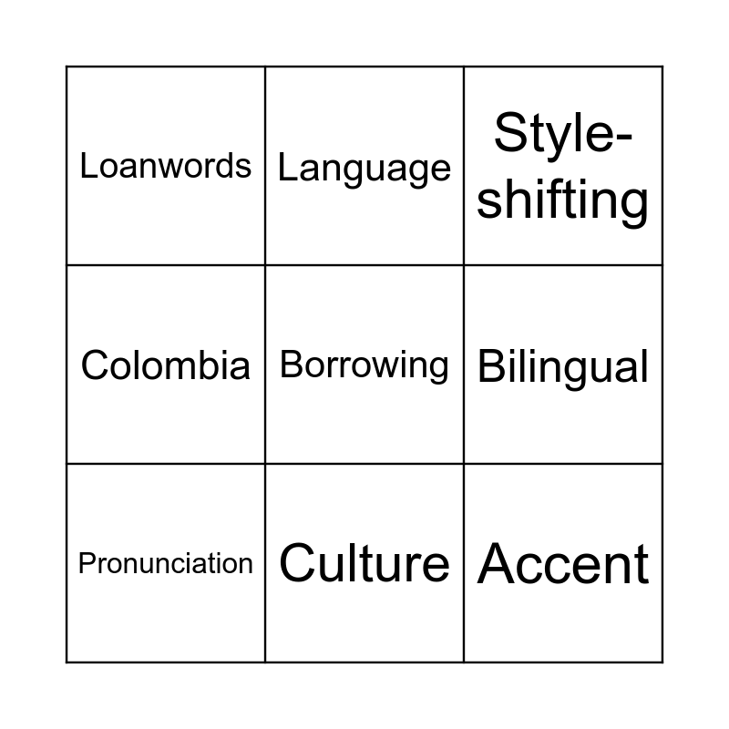 This bingo card has 9 words: Pronunciation, Style-shifting, Language, Colombia, Loanwords, Bilingual, Borrowing, Accent and Culture.