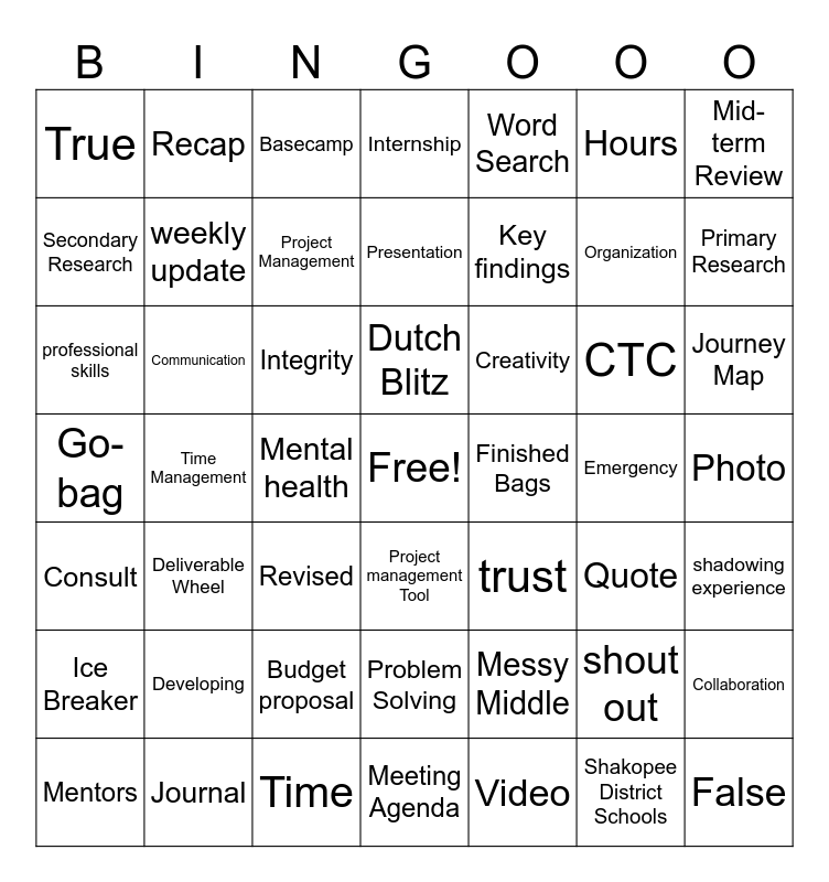 This bingo card has a free space and 51 words: Mentors, Organization, School links, Time Management, Integrity, trust, Recap, Video, Hours, Quote, Mid-term Review, Internship, CTC, Creativity, Problem Solving, Consult, Secondary Research, Primary Research, Journal, Word Search, Key findings, Mental health, True, weekly update, Time, False, Project Management, Meeting Agenda, Journey Map, Basecamp, Planner, Deliverable Wheel, Budget proposal, Messy Middle, Project management Tool, Go-bag, Emergency, shadowing experience, Ice Breaker, Developing, professional skills, Communication, shout out, Shakopee District Schools, Finished Bags, Photo, Presentation, Revised, Collaboration, Dutch Blitz and Initiative.