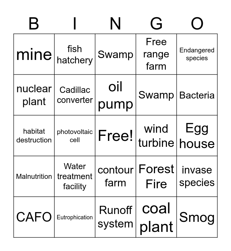 This bingo card has a free space and 24 words: Water treatment facility, Eutrophication, oil pump, CAFO, Endangered species, mine, nuclear plant, fish hatchery, wind turbine, contour farm, Swamp, habitat destruction, Forest Fire, invase species, Cadillac converter, coal plant, Egg house, Swamp, Bacteria, photovoltaic cell, Smog, Malnutrition, Free range farm and Runoff system.