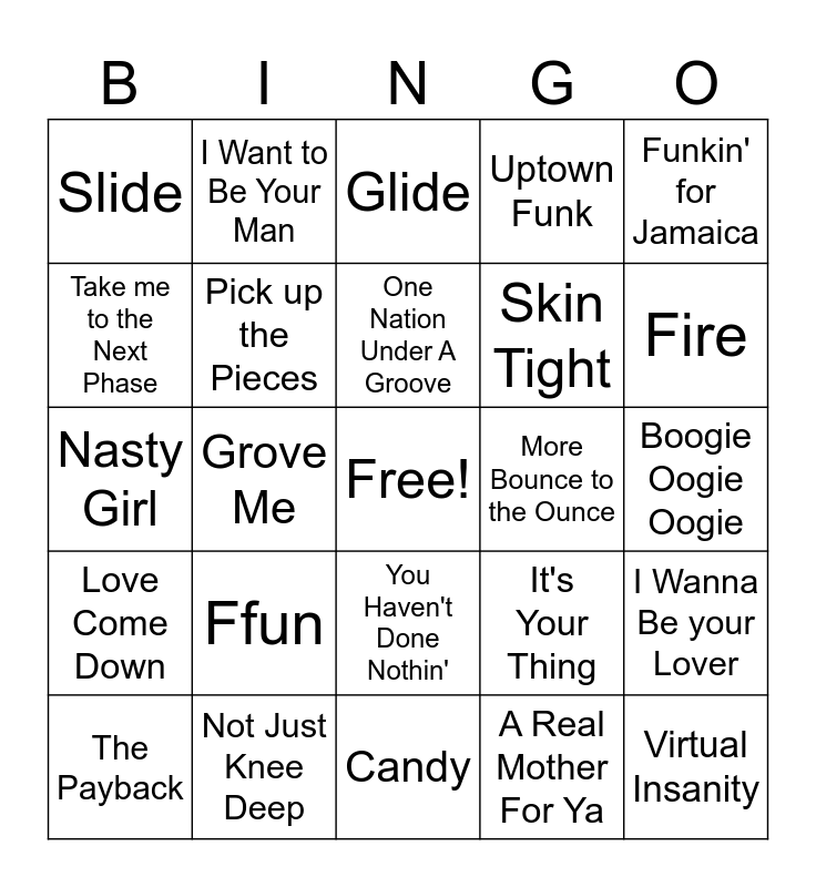 This bingo card has a free space and 39 words: Jungle Boogie, If I had No Loot, Tennesee, Pick up the Pieces, The Payback, You Haven't Done Nothin', One Nation Under A Groove, Strawberry 23, Funkin' for Jamaica, Love Come Down, Grove Me, Uptown Funk, Virtual Insanity, Boogie Oogie Oogie, More Bounce to the Ounce, Ffun, Flash Light, Slide, Burn Rubber On Me, It's Your Thing, Take me to the Next Phase, Candy, Skin Tight, Fire, If You Want Me to Stay, Tell Me Something Good, Give it to me Baby, Atomic Dog, Fantastic Voyage, I Want to Be Your Man, Thank You, Musicology, Glide, Not Just Knee Deep, A Real Mother For Ya, You Sexy Thing, I Wanna Be your Lover, Nasty Girl and Alligator Woman.