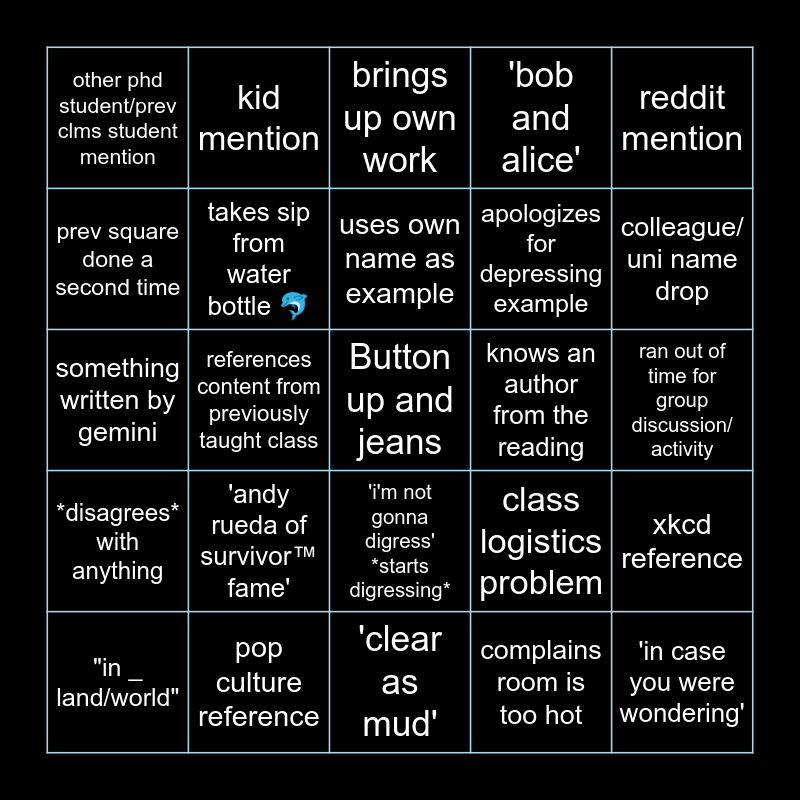 This bingo card has a free space and 34 words: Mentions former workplace, complains room is too hot, greek or finnish example, Obligatory meme, *disagrees* with anything, takes sip from water bottle 🐬, reddit mention, "in _ land/world", kid mention, LLM's are bad at X, uses own name as example, brings up own work, brandeis example, jonne mention, knows an author from the reading, colleague/ uni name drop, pop culture reference, something written by gemini, 'andy rueda of survivor™ fame', class logistics problem, 'i'm not gonna digress' *starts digressing*, didn't get enough sleep, other phd student/prev clms student mention, ran out of time for group discussion/ activity, 'clear as mud', 'in case you were wondering', 'bob and alice', quiz hint, apologizes for depressing example, prev square done a second time, writes on board, references content from previously taught class, xkcd reference and points out tour group.