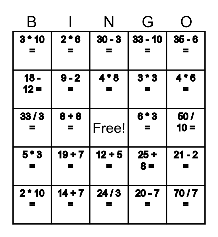 This bingo card has a free space and 34 words: 15 - 14 =, 30 / 15 =, 12 - 9 =, 2 * 2 =, 50 / 10 =, 18 - 12 =, 9 - 2 =, 24 / 3 =, 3 * 3 =, 70 / 7 =, 33 / 3 =, 2 * 6 =, 20 - 7 =, 28 / 2 =, 5 * 3 =, 8 + 8 =, 12 + 5 =, 6 * 3 =, 21 - 2 =, 2 * 10 =, 14 + 7 =, 11 * 2 =, 33 - 10 =, 4 * 6 =, 5 * 5 =, 19 + 7 =, 30 - 3 =, 7 * 4 =, 35 - 6 =, 3 * 10 =, 24 + 7 =, 4 * 8 =, 25 + 8 = and 40 - 6 =.