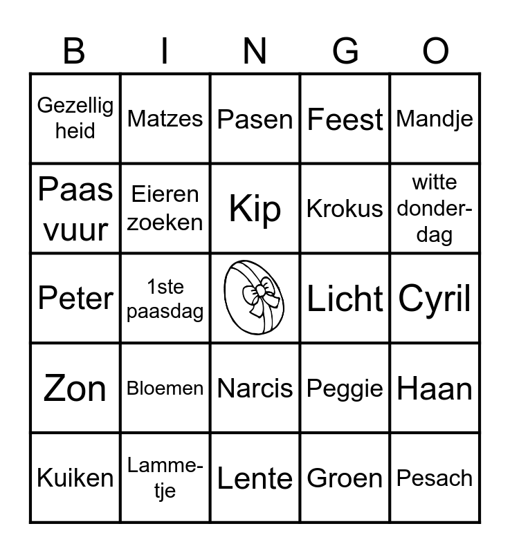 This bingo card has a free space and 54 words: Apostelen, Bloemen, Bloesem, Choco- lade, Cyril, Eieren, Eieren zoeken, Familie, Feest, Geel, Gezellig heid, Goede Vrijdag, Groen, Haan, Jezus, Kaya, Kip, Krokus, Kruis-iging, Kuiken, Lamme-tje, Lente, Licht, Mandje, Marja, Matzes, Narcis, Paas-bingo, Paas-brood, Paas brunch, Paasei, Paas haas, Paas mand, Paas ontbijt, Paas vuur, Palm pasen, Pasen, Peggie, Pesach, Peter, Pilatus, Proces sie, Sneeuw klokje, Tulp, Vasten tijd, Vogels, Vrolijk Pasen, weder op- standing, witte donder-dag, Zon, 1ste paasdag, Paas-tak, Konijn and 2de paasdag.