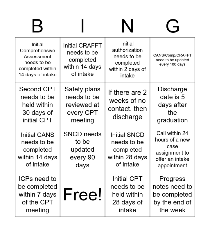 This bingo card has 16 words: Free!, Call within 24 hours of a new case assignment to offer an intake appointment, Initial authorization needs to be completed within 2 days of intake, Initial Comprehensive Assessment needs to be completed within 14 days of intake, Initial CANS needs to be completed within 14 days of intake, Initial CRAFFT needs to be completed within 14 days of intake, Initial SNCD needs to be completed within 28 days of intake, Initial CPT needs to be held within 28 days of intake, Second CPT needs to be held within 30 days of initial CPT, Safety plans needs to be reviewed at every CPT meeting, ICPs need to be completed within 7 days of the CPT meeting, CANS/Comp/CRAFFT need to be updated every 180 days, SNCD needs to be updated every 90 days, Discharge date is 5 days after the graduation, If there are 2 weeks of no contact, then discharge and Progress notes need to be completed by the end of the week.