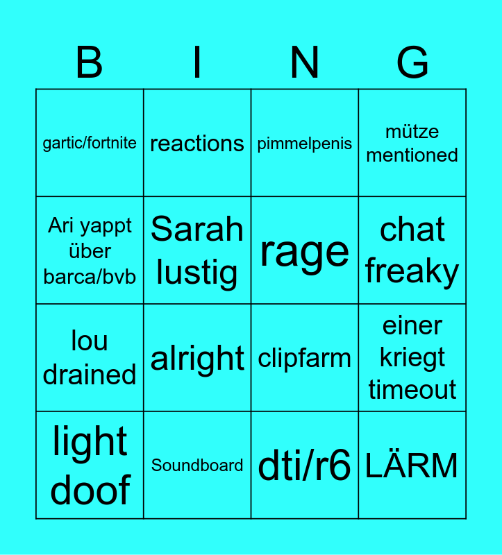 This bingo card has 16 words: Soundboard, einer kriegt timeout, pimmelpenis, gartic/fortnite, lou drained, reactions, clipfarm, dti/r6, Ari yappt über barca/bvb, Sarah lustig, light doof, mütze mentioned, alright, chat freaky, rage and LÄRM.