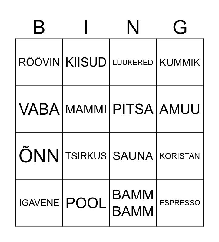 This bingo card has 16 words: POOL, KORISTAN, LUUKERED, RÖÖVIN, ÕNN, KIISUD, SAUNA, BAMM BAMM, VABA, MAMMI, IGAVENE, KUMMIK, TSIRKUS, AMUU, PITSA and ESPRESSO.