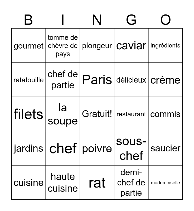 This bingo card has a free space and 24 words: chef, haute cuisine, Paris, cuisine, ingrédients, gourmet, ratatouille, tomme de chèvre de pays, restaurant, poivre, délicieux, filets, sous- chef, saucier, chef de partie, demi- chef de partie, commis, plongeur, crème, la soupe, mademoiselle, jardins, caviar and rat.